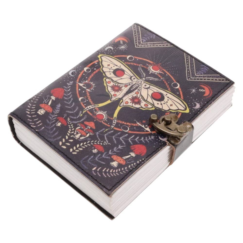 Capture your thoughts, spells, sketches or intentions in this enchanting Luna Moth & Mushroom leather journal. Featuring a mystical luna moth surrounded by celestial symbols and woodland mushrooms, this beautifully detailed journal is crafted with embossed leather covers and finished with a vintage-style metal clasp to keep your writings protected.