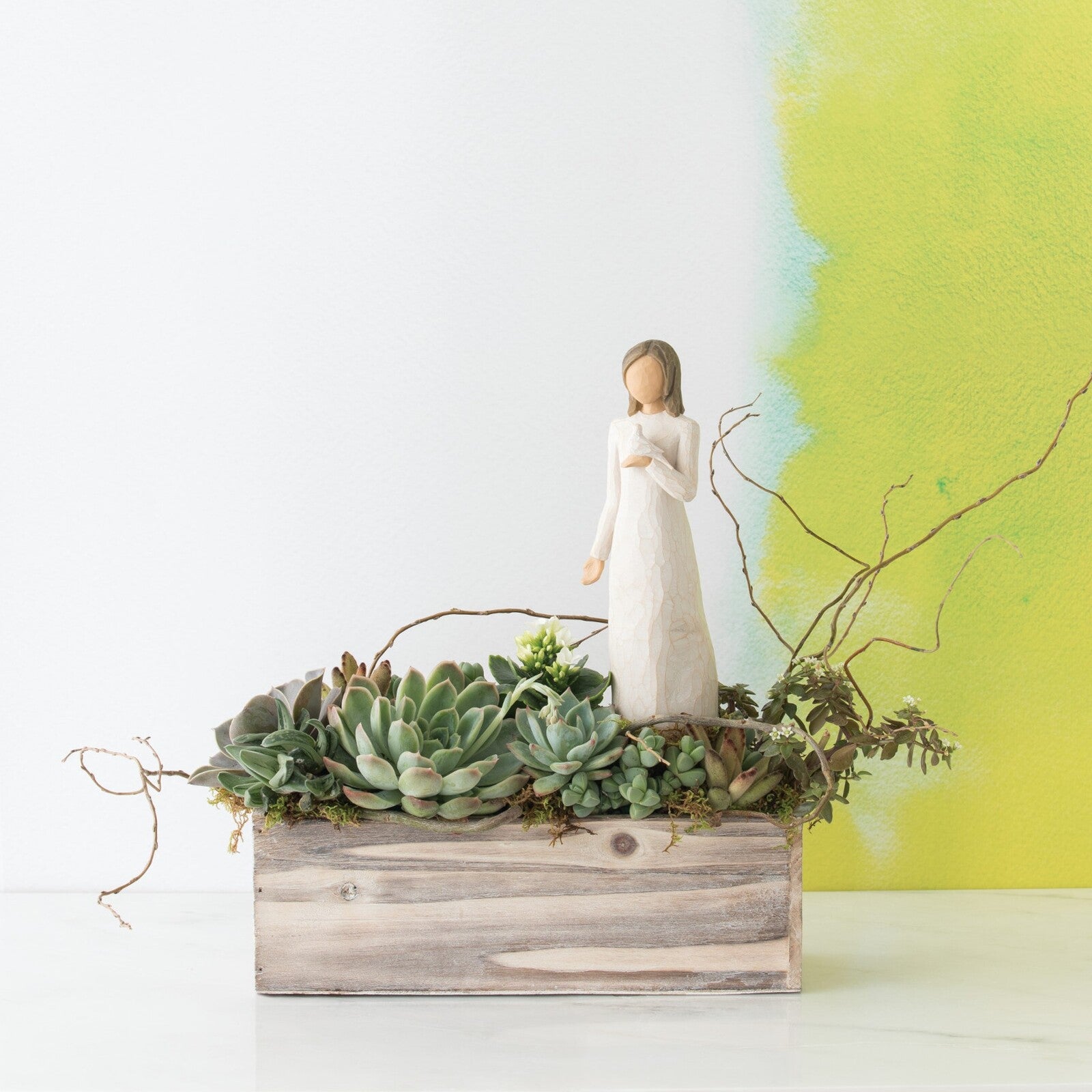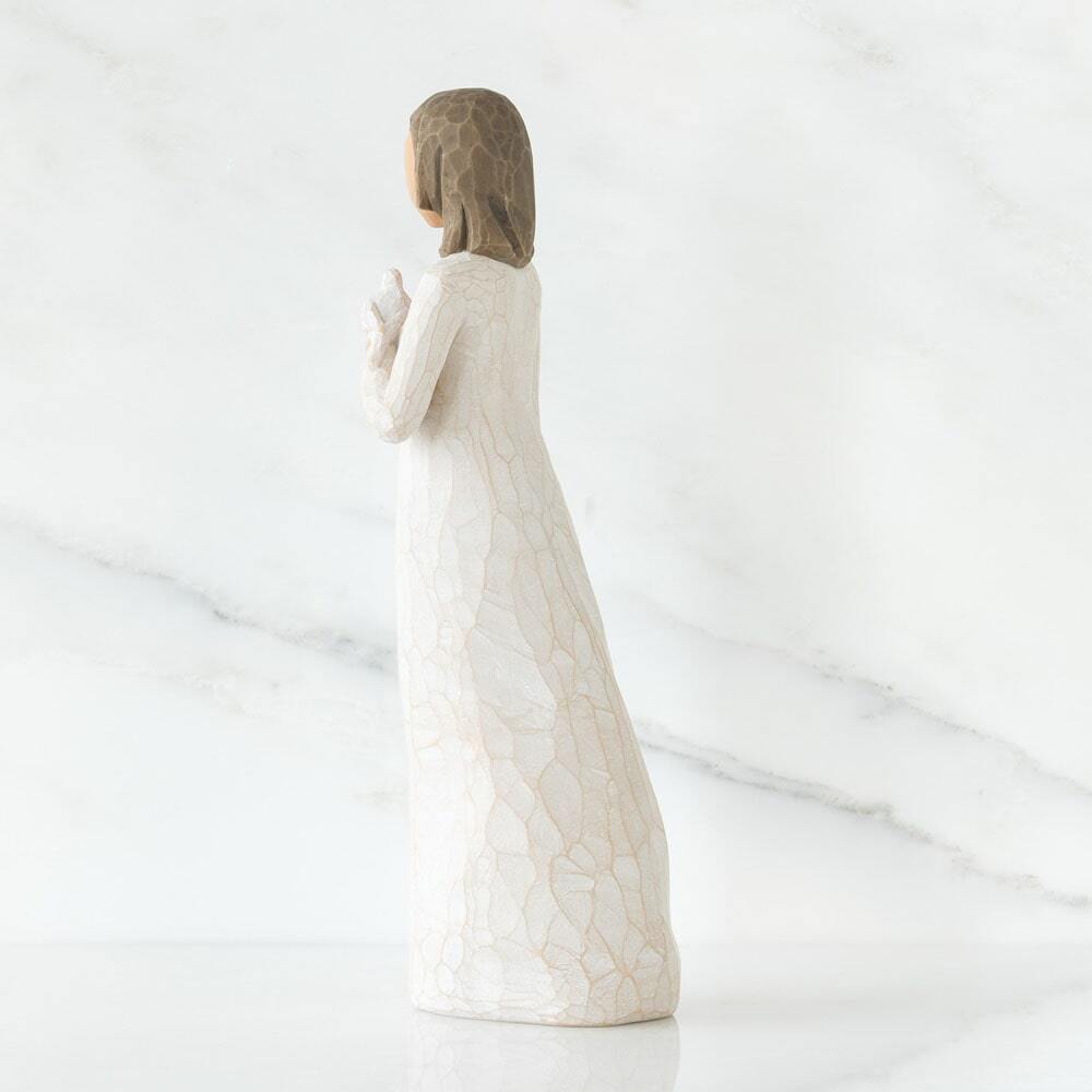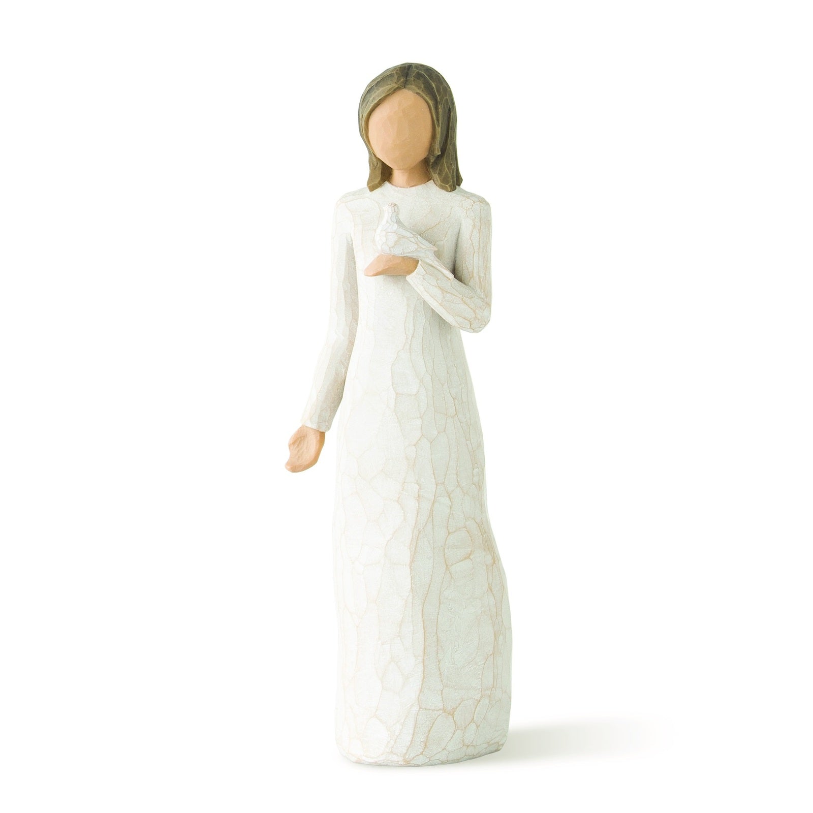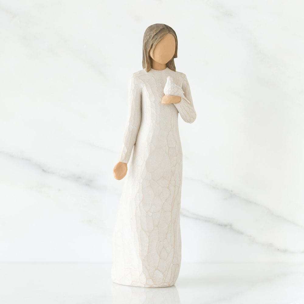 Hand-sculpted by Susan Lordi, the figure’s open, reflective gesture and the white dove she holds represent inner peace, purity and the enduring beauty of the soul.